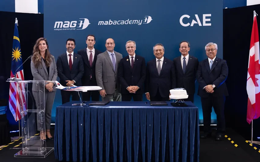 Perdana Menteri Kanada Mark Carney (empat dari kanan), Pengarah Urusan MAG Izham Ismail (dua dari kanan) bersama pegawai kerajaan Kanada, CAE Inc, Khazanah Nasional Bhd dan MAG pada majlis menandatangani perjanjian antara MAB Academy dan CAE bagi pembekalan simulator penerbangan penuh Boeing 737-8. (Gambar CAE)