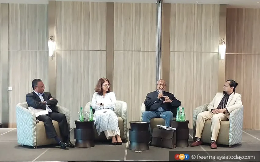 Lawyer Shafee Abdullah speaking at the Malaysian Legal Aid Convention 2025 in Penang. With him are (from left) N Murelidaran (moderator), Sangeet Kaur Deo and Arif Shaharuddin.