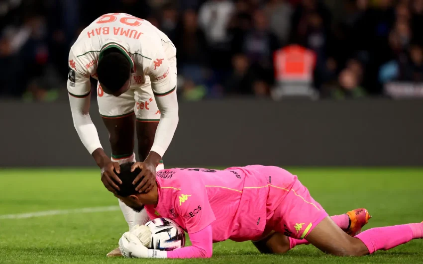 Nice defender Juma Bah appreciates his goalkeeper Yehvann Diouf after a brilliant save during the French L1 match at the Parc des Princes stadium in Paris. (AFP pic)