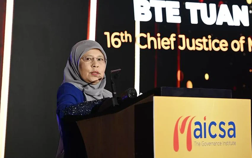 Former chief justice Tengku Maimun Tuan Mat delivering a keynote address at the 66th anniversary of the Malaysia Institute of Chartered Secretaries and Administrators in Kuala Lumpur. (Maicsa pic)