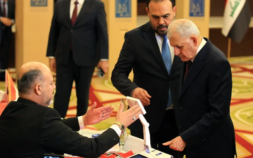 Iraqi President Abdul Latif Rashid (right) arrives to cast his vote in the parliamentary elections at a polling station in Baghdad. (EPA Images pic)