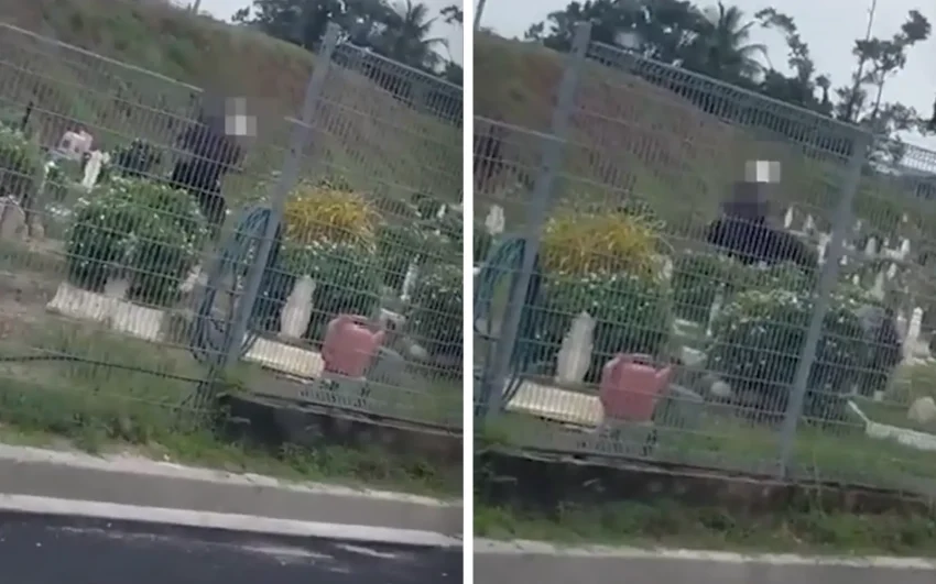 Tangkap layar video tular memaparkan seorang lelaki memakai jaket serta bertopi keledar berdiri di kawasan perkuburan sambil melakukan beberapa gerakan tangan dan kaki.