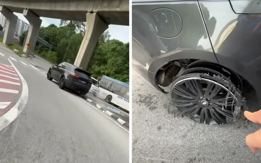 Video kejadian itu dirakam seorang penunggang motosikal dengan memaparkan sebuah kenderaan jenis Range Rover Velar dipandu bahaya dengan tayar belakang sebelah kanan pecah sehingga menampakkan rim.