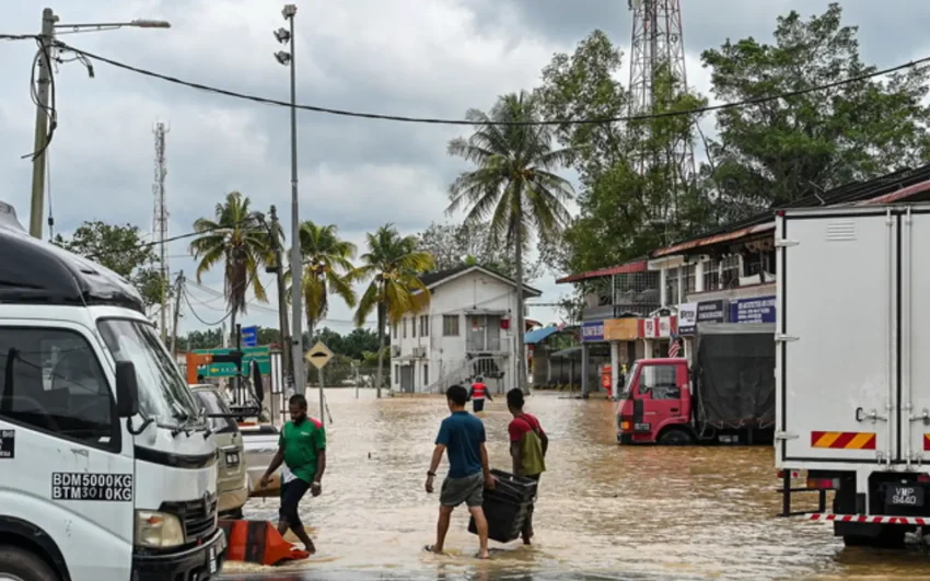 Orang ramai gigih membawa barangan untuk berpindah ke kawasan selamat, berikutan kenaikan Sungai Linggi susulan hujan lebat sejak semalam. (Gambar Bernama)
