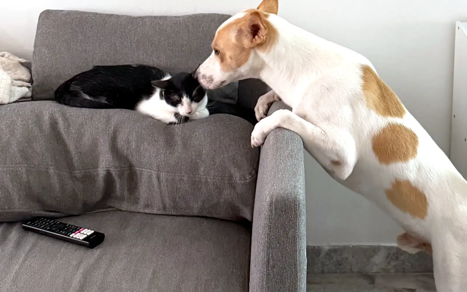 Then comes the blur – a streak of black-and-white fur tearing through the living room at full speed, skidding around corners, launching into mid-air turns, and play-fighting with the house dog Billie like they’ve been frenemies their whole lives.
