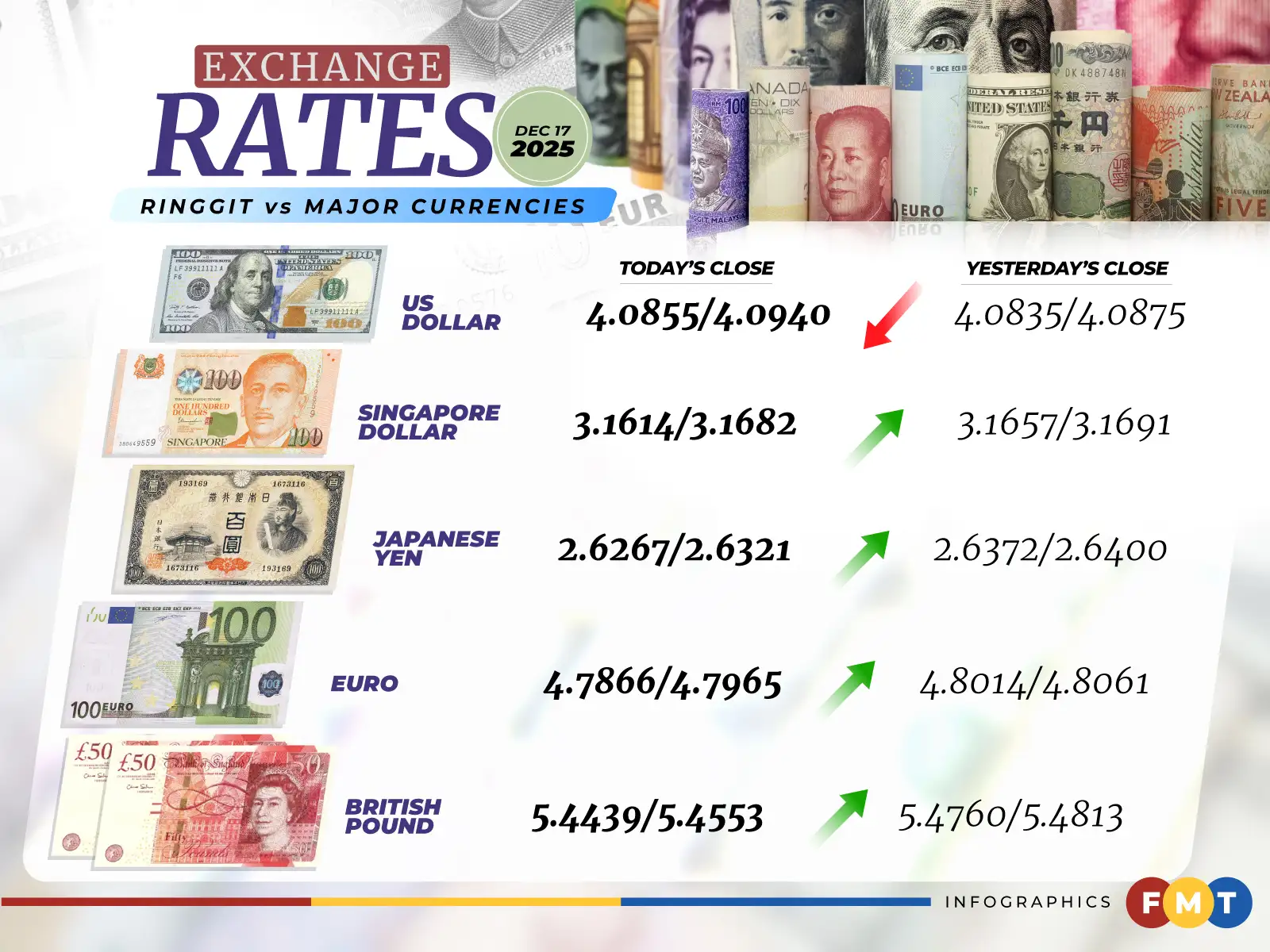 At 6pm, the ringgit inched down to 4.0855/4.0940 against the greenback, from 4.0835/4.0875 at yesterday’s close.