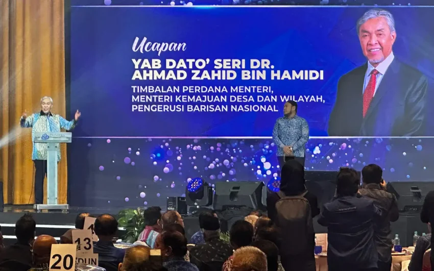 Pengerusi BN Zahid Hamidi mengumumkan pencalonan Naim Kurniawan sebagai calon PRK Parlimen Kinabatangan. (Gambar Naim Kurniawan)