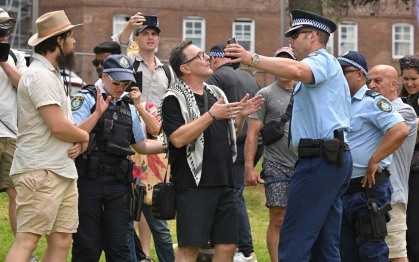 Police speak to a pro-Palestine protester as bystanders heckle him at Bondi Pavilion in Sydney. (EPA Images pic)