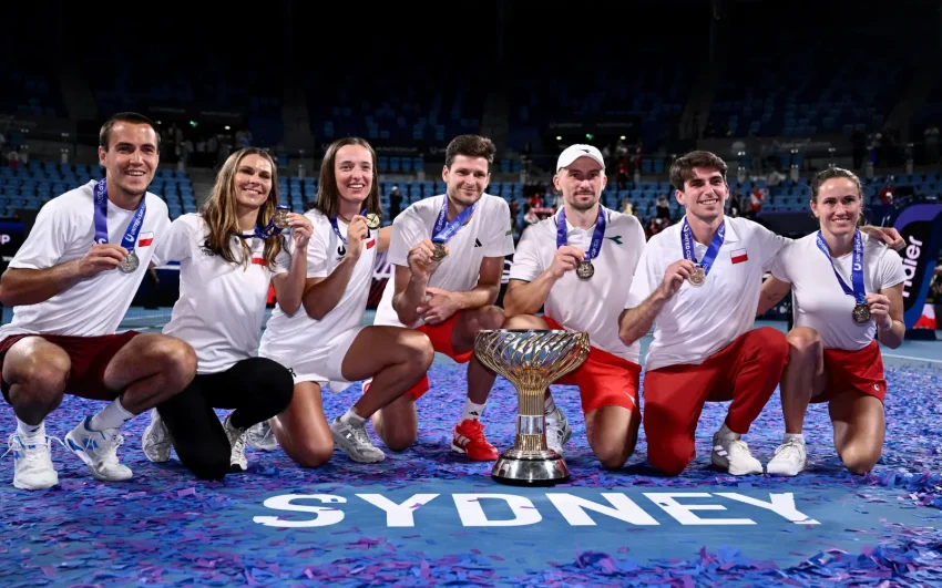 Team Poland pose for photos after winning the 2026 United Cup final against Switzerland in Sydney. (EPA Images pic)