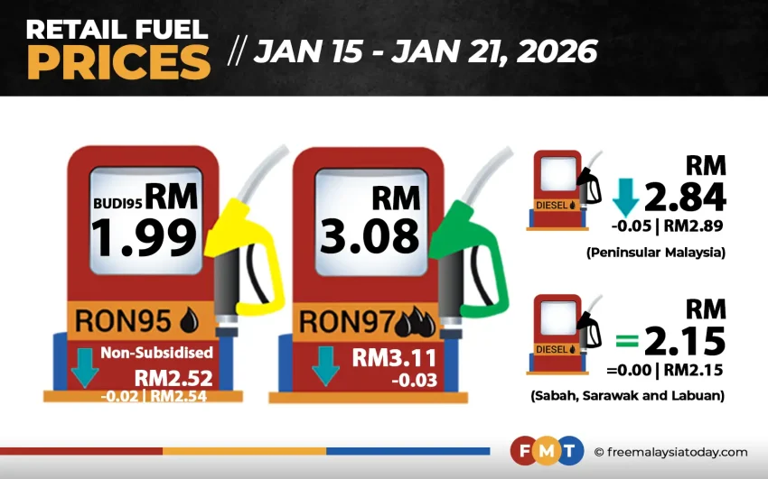Subsidised RON95 under the Budi95 programme remains at RM1.99 per litre, while diesel in Sabah, Sarawak and Labuan stays at RM2.15 per litre.