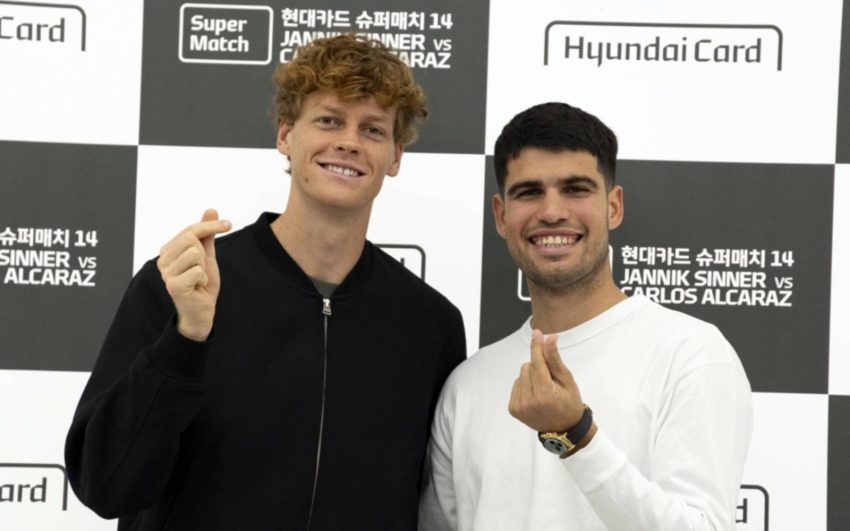 Jannik Sinner (left) and Carlos Alcaraz pose for photos after a press conference ahead of an exhibition match in Incheon. (EPA Images pic)