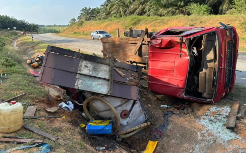 The lorry transporting palm oil pesticide was travelling from Felda Redong to Felda Selancar when the accident occurred at about 2.25pm, Sharif said.