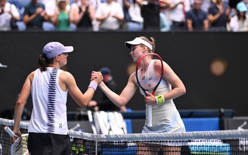 Elena Rybakina (right) receives congratulations from Iga Swiatek after her quarter-finals win at Melbourne Park. (EPA Images pic)