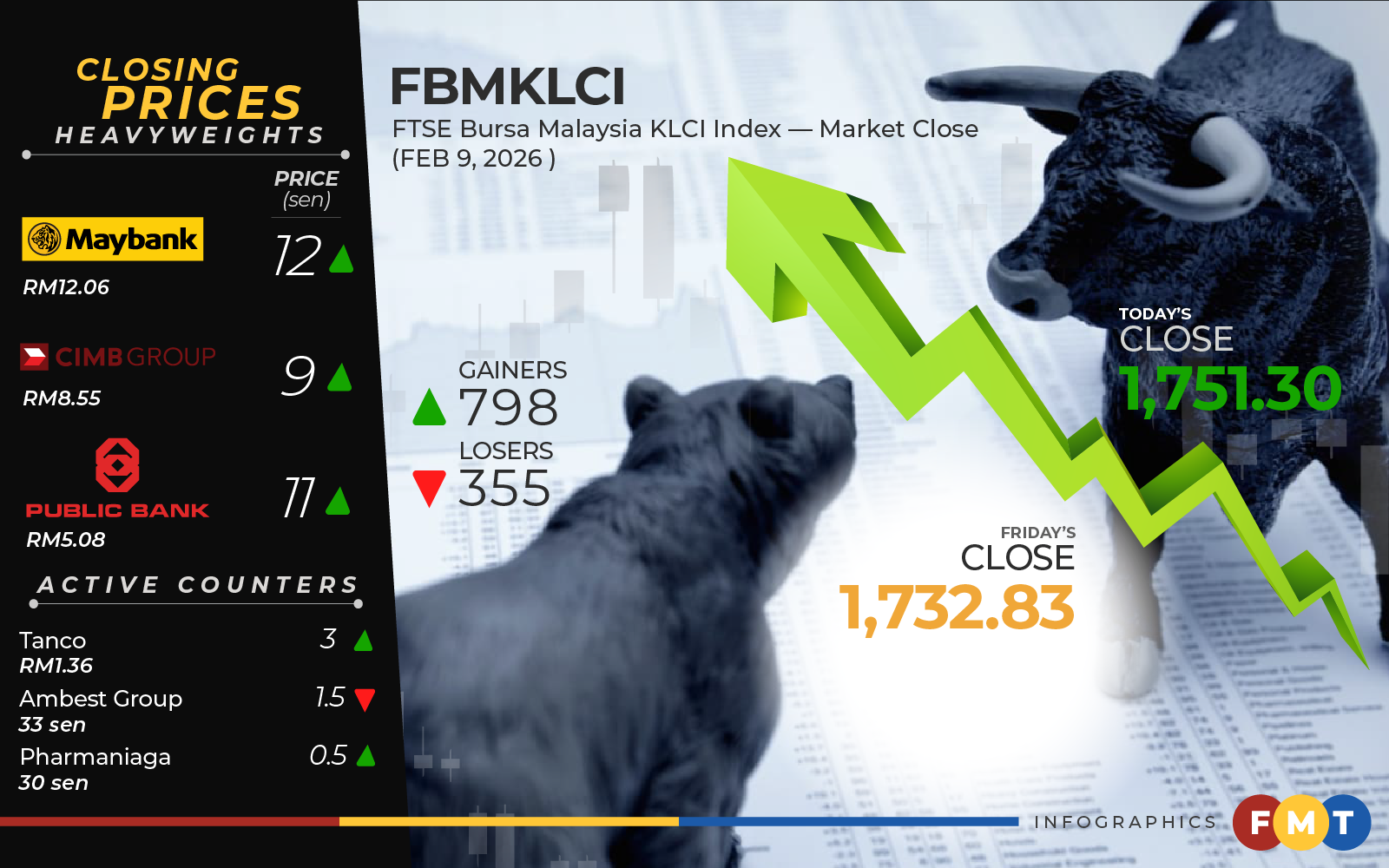 Among heavyweight stocks, Maybank gained 12 sen to RM12.06, Public Bank added 11 sen to RM5.08, and CIMB Group firmed nine sen to RM8.55. Tenaga Nasional climbed 20 sen to RM14.14, and IHH Healthcare grew 14 sen to RM8.94.