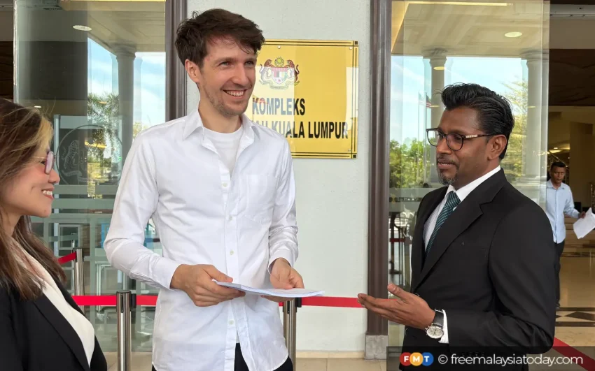 Pelukis jalanan dari Lithuania, Ernest Zacharevic bersama peguamnya ketika bertemu wartawan di luar Mahkamah Tinggi Kuala Lumpur hari ini.
