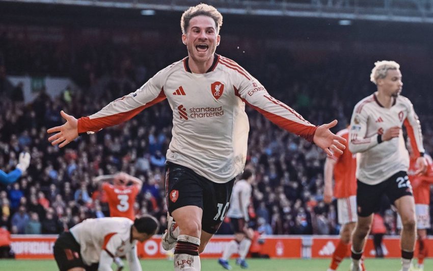 Liverpool’s Alexis Mac Allister celebrates after scoring the winner deep into stoppage time against Nottingham Forest at the City Ground. (Liverpool pic)