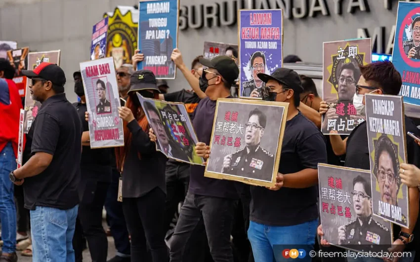 Protesters holding up placards calling for MACC chief Azam Baki’s resignation and arrest in front of the agency’s headquarters in Putrajaya.