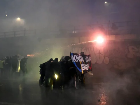 Police fire water cannon at protesters hurling smoke bombs in Olympic host Milan