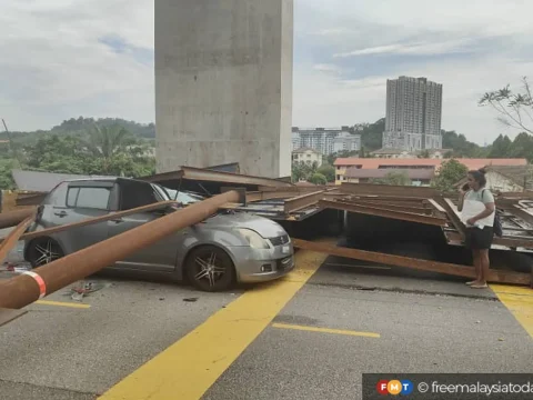 The car crushed by a section of the ECRL construction structure that collapsed onto Jalan MRR2 near Batu Caves on…