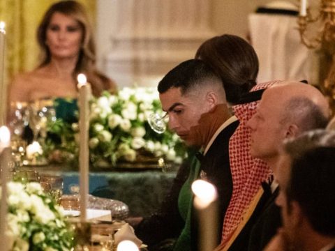 Cristiano Ronaldo looks on as President Donald Trump speaks at a White House dinner for Saudi Crown Prince Mohammed bin…