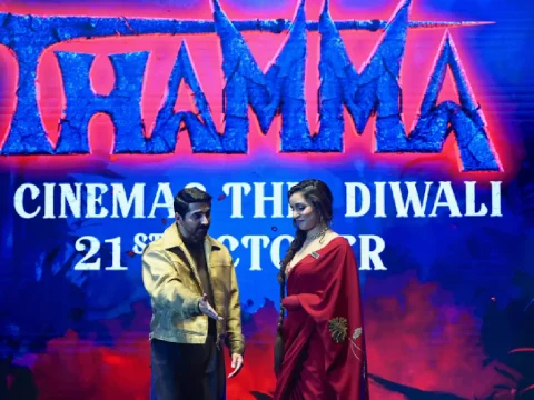 Bollywood actors Ayushmann Khurrana and Shraddha Kapoor pose during the trailer launch of their Hindi-language romantic comedy–horror film Thamma in…