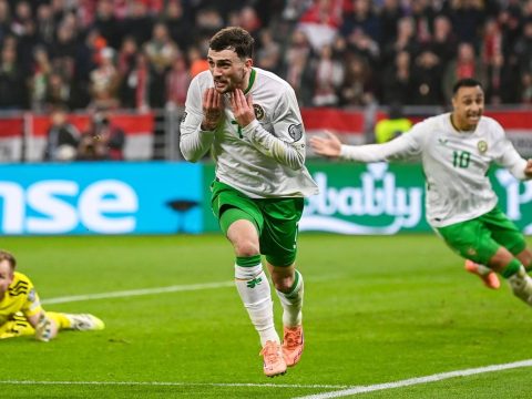 Republic of Ireland’s Troy Parrott (centre) celebrates after his dramatic 96th-minute winner secures a 3-2 victory over Hungary. (EPA Images…