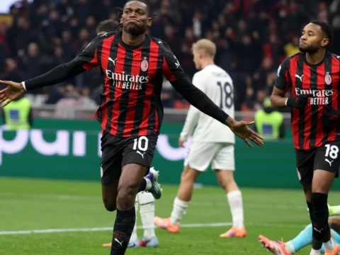 AC Milan’s Rafael Leao celebrates after scoring the opening goal in the Serie A match between AC Milan and SS…
