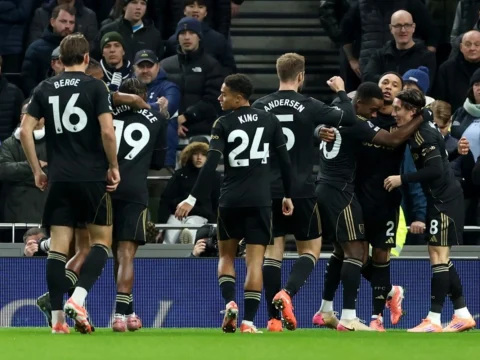 Kenny Tete (2nd from right) of Fulham celebrates with teammates after scoring the opening goal during the Premier League match…