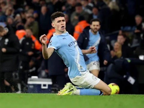 Manchester City’s Phil Foden celebrates after scoring his second goal during the English Premier League match against Leeds United in…