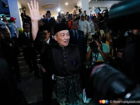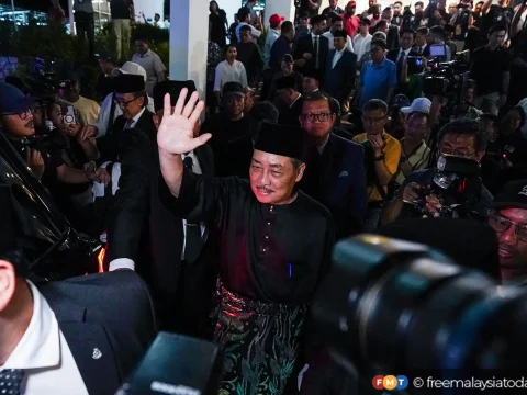 GRS chairman Hajiji Noor, dressed in formal Baju Melayu, waving to supporters as he made his way to Istana Seri…