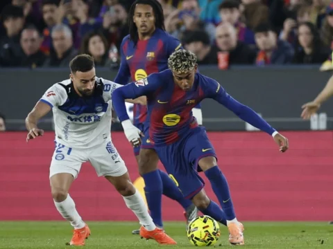 FC Barcelona’s Lamine Yamal (right) in action against Alaves’ Abde Rebbach (left) during a Spanish LaLiga match. (EPA Images pic)…