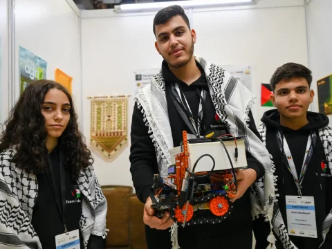 Palestinian participants Razan Shawar (left), Jehad Abudayyah (right), and Mustafa Assi pose with their robot design at the World Robot…