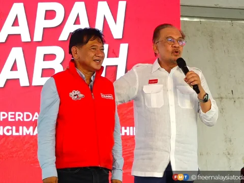 Prime Minister Anwar Ibrahim with Pakatan Harapan candidate Awang Husaini Sahari at a campaign stop in Petagas. PUTATAN: Pakatan Harapan’s…