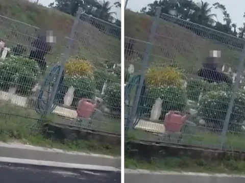 Tangkap layar video tular memaparkan seorang lelaki memakai jaket serta bertopi keledar berdiri di kawasan perkuburan sambil melakukan beberapa gerakan…