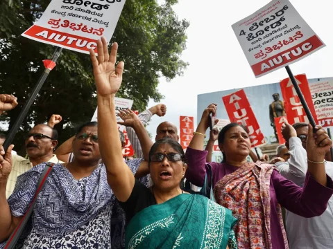 Members of the All India United Trade Union Centre shout slogans against the BJP-led Indian government during a protest in…