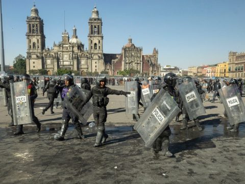 Riot police officers walk at the Zócalo Square during a rally against Mexico’s President Claudia Sheinbaum in Mexico City. (AFP…