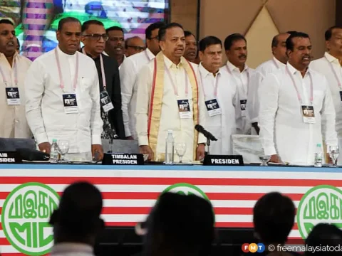 MIC president SA Vigneswaran (centre) joined by the party’s central leadership at its annual general meeting today. SHAH ALAM: MIC…