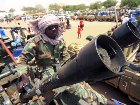 A militia fighter guards military equipment reportedly captured during the assault on a contested area in South Darfur. (EPA Images…