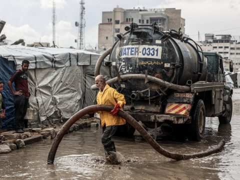 A Palestinian worker drains stagnant water from a road near a displacement camp following the first winter rainfall in Gaza…