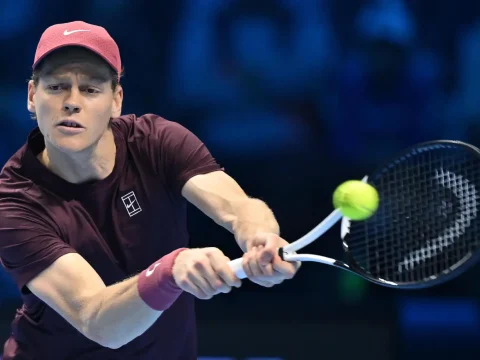 Italian Jannik Sinner in action during a men’s singles round robin tennis match at the ATP Finals. (EPA Images pic)…