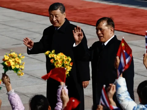 Thailand’s King Maha Vajiralongkorn (right) and Chinese President Xi Jinping attend a welcoming ceremony at the Great Hall of the…