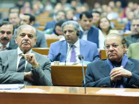 Pakistan’s Prime Minister Shehbaz Sharif (left) with his brother and former Prime Minister Nawaz Sharif (right ) attend parliament session…