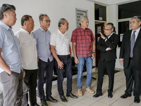 Yip Kok Wai (third from right), his three brothers and workshop manager Ho Voon Leong with their lawyers outside the…