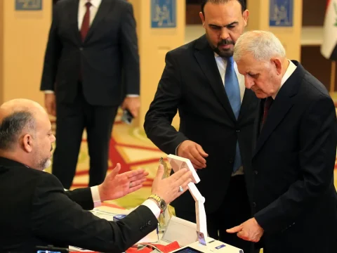 Iraqi President Abdul Latif Rashid (right) arrives to cast his vote in the parliamentary elections at a polling station in…