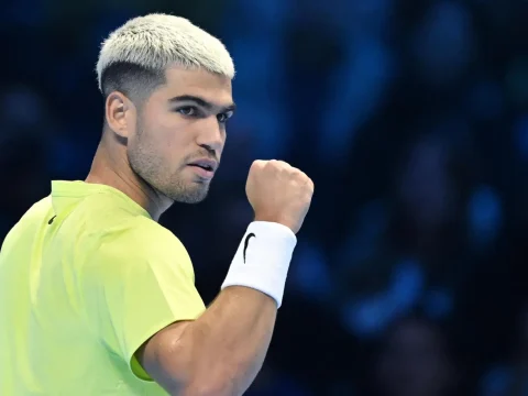 Spain’s Carlos Alcaraz gestures during a Singles Round Robin match at the ATP Finals in Turin, Italy. (EPA Images pic)…