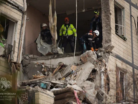 Ukrainian rescuers work at the site of a heavily damaged residential building after an air attack in Dnipro, amid Russia’s…