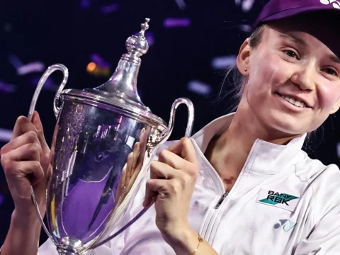 Kazakhstan’s Elena Rybakina holds the trophy after defeating Belarusian Aryna Sabalenka in the final of the Women’s WTA Finals. (AFP…