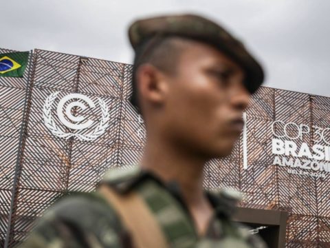 An Armed Forces member stands guard at the COP30 Summit entrance in Belém after social and indigenous protesters tried to…