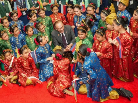 Members of the Vocal Pizzest Show Choir with Prime Minister Anwar Ibrahim after they performed at the closing ceremony of…
