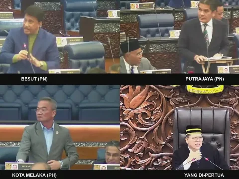 Kota Melaka MP Khoo Poay Tiong (bottom left) arguing with opposition MPs over fugitive businessman Adlan Berhan and the Penang…